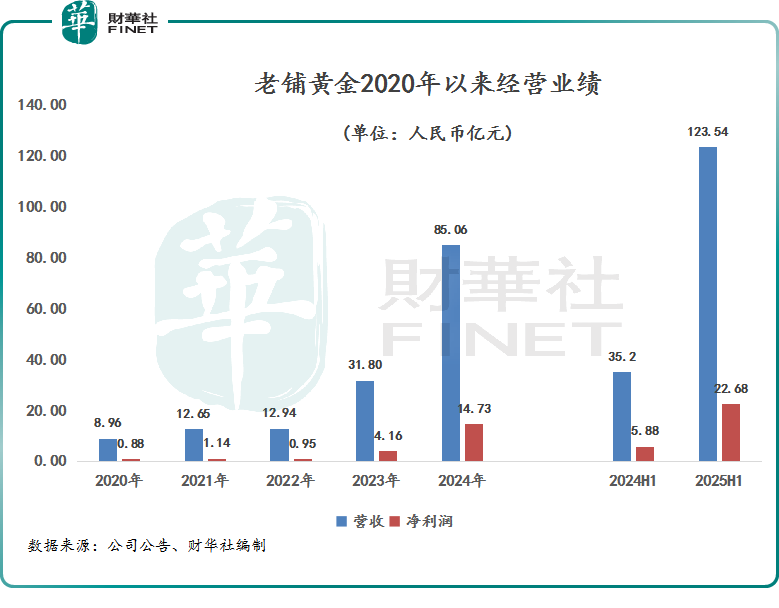 根据业绩报,于今年上半年,老铺黄金实现营业收入123.54亿元(单位人民币,下同),同比大幅增长251%;期内利润为22.68亿元,同比增幅达285.8%。