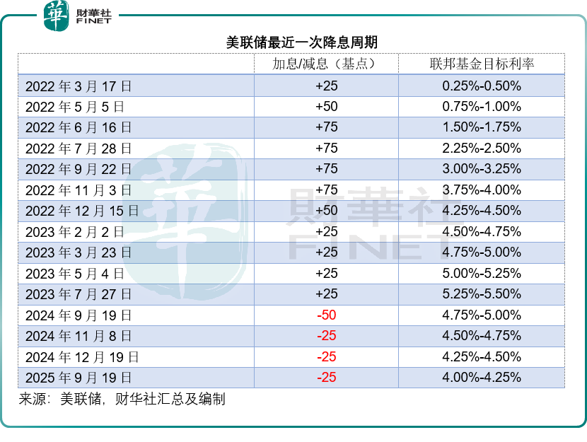 一如预期,FOMC决定将联邦基金利率目标区间下调25个基点,至4.00%-4.25%,这也是2024年12月以来的首次降息,见下表。与此同时,FOMC表示会继续缩减所持有的国债、机构债券和机构抵押贷款支持证券。
