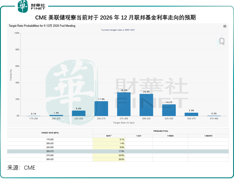 从CME美联储观察的数据来看,华尔街普遍预期联邦基金利率到2026年12月会低至2.75%-3.00%(几率为28.6%),或者3.00%-3.25%(几率为26.8%),见下图,更进取一点。