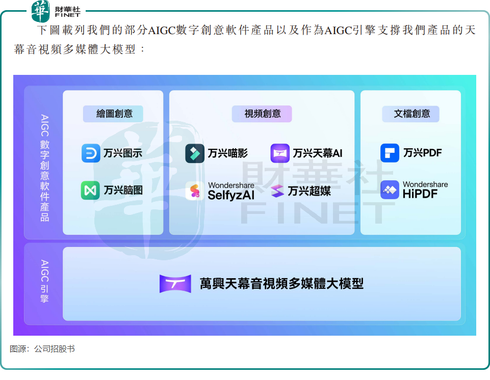 公司自主研发了专注于AIGC内容创作的天幕音视频多媒体大模型,支撑三大产品线——绘图创意、视频创意(包括万兴喵影/Filmora、SelfyzAI等)和文档创意。