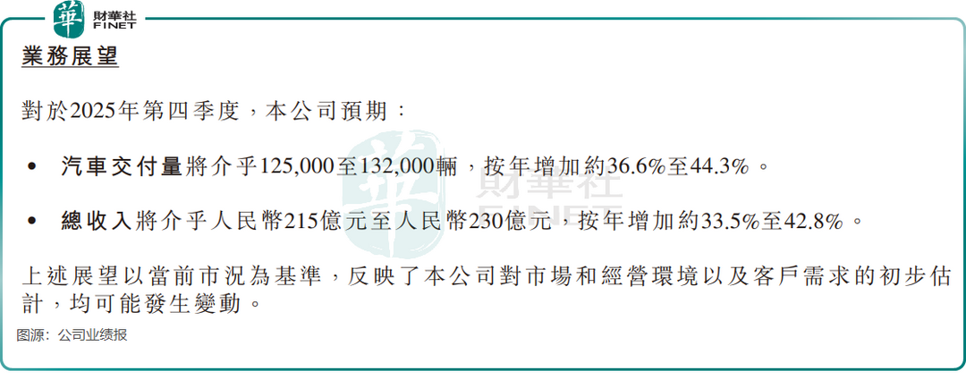 公司预计第四季度汽车交付量介于12.5万至13.2万辆,同比增长约36.6%至44.3%;总收入预计在215亿元至230亿元之间,同比增长约33.5%至42.8%。