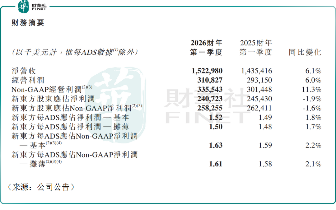 10月末,新东方公布了2026财年第一季度(截至2025年8月31日)未经审核业绩。公司实现净营收15.23亿美元,同比增长6.1%;经营利润3.11亿美元,同比增长6.0%。