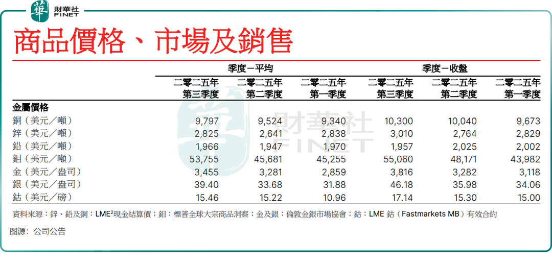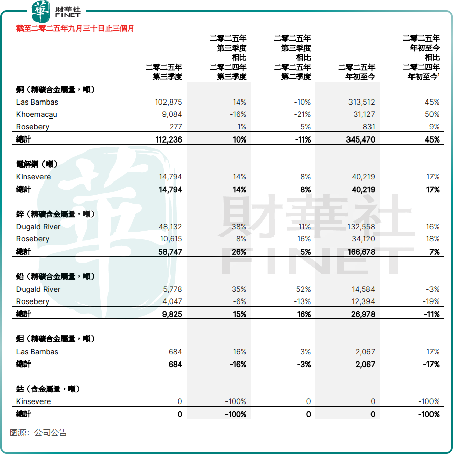 五矿资源生产端数据表现亮眼。据公司三季度生产报告显示,旗下矿山整体处于产能爬坡期,精准契合市场需求及贵金属价格上涨趋势。2025年第三季度,公司铜总产量(含铜精矿含铜及电解铜)达12.7万吨,同比增长11%;锌总产量5.87万吨,同比增幅高达26%。