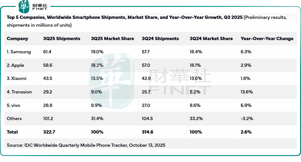 但我们留意到,第2季之后推出新品后,传音的2025年第3季智能手机交付量数据似有改善,行业调研公司IDC的数据显示,传音第3季的智能手机交付量按年增长13.6%,至29.2百万部,市场份额按年提升0.8个百分点,至9.0%,从第2季的排名第五重返第四,见下表,在五大厂商中,传音的2025年第3季智能手机交付量增幅最高。