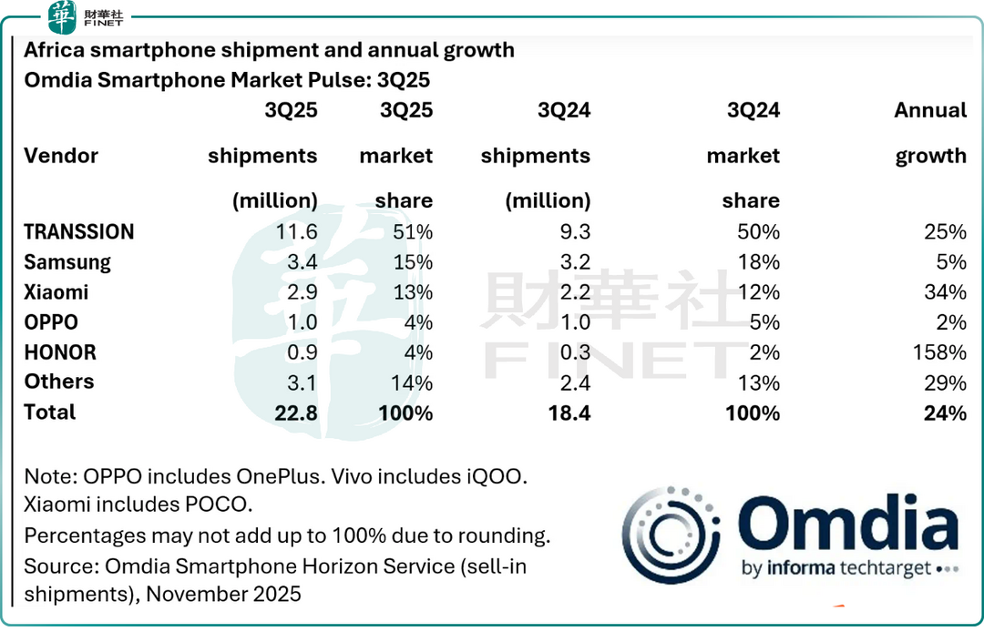 从下表可见,2025年第3季小米和荣耀在非洲市场的智能手机交付量按年增幅分别达到34%和158%,远超传音。