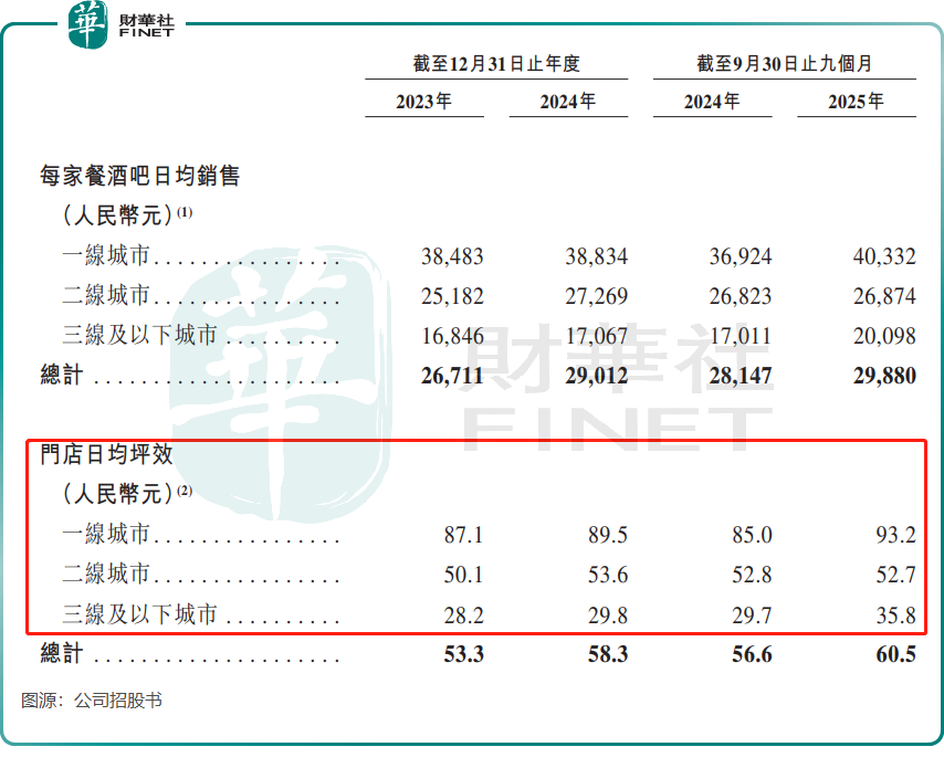 面对一二线城市的增长压力,极物思维将目光投向了下沉市场,计划未来三年逐步向三线及以下城市渗透。但从现有数据来看,下沉之路并不平坦,2025年前三季度其三线及以下城市每家餐酒吧日均销售额约2.01万元,仅为一线城市的一半;客单价137.5元,明显低于一线城市的220.8元,反映出低线城市消费能力与饮酒习惯的差异。