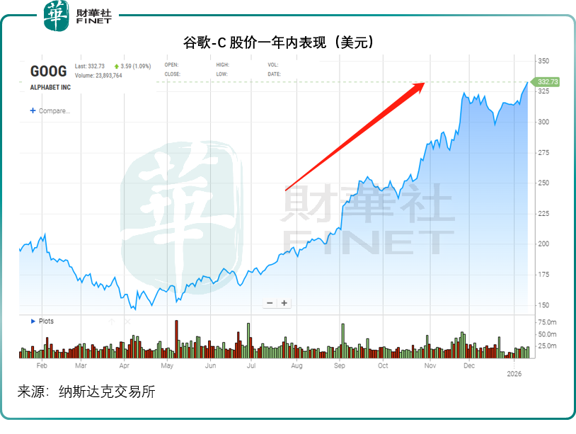 曾经的全球市值冠军苹果,因AI发展不及预期逐渐失势:2026年以来,其股价累跌4.27%,市值停留在3.83万亿美元;而谷歌凭借Gemini的杰出表现,股价在2025年下半年奋勇攀升,2026年初市值突破4万亿美元,超越苹果成为全球第二大市值上市公司,直逼行业龙头英伟达(NVDA.US)的4.49万亿美元,见下图。