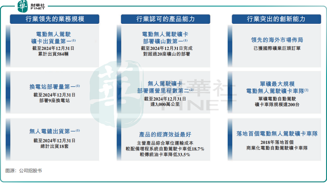 市场地位方面,根据灼识咨询数据,2024年按出货量及收入计,伯镭科技已是全球最大的电动自动驾驶矿卡提供商;截至2024年底,其累计部署矿卡584辆,覆盖超过20座矿山,换电站部署量及无人电铲出货量均位居行业第一。