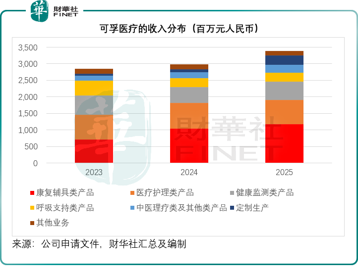 在业务结构上,康复辅具类产品始终是可孚医疗的核心营收支柱。2025年该品类实现收入11.78亿元,收入占比达34.78%。从毛利率角度看,康复辅具类产品的毛利率从2023年的48.41%攀升至2025年的63.20%,医疗护理类、健康监测类、呼吸支持类产品的毛利率也均有不同程度的提升。