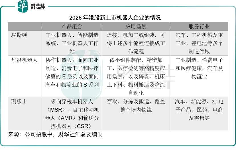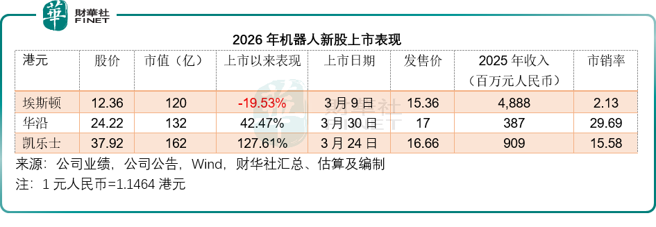 但进入2026年,市场情绪悄然转向理性,甚至带着几分谨慎,这种转变在今年上市的三家机器人企业身上体现得淋漓尽致——埃斯顿(02715.HK)、华沿机器人(01021.HK)、凯乐士(02729.HK)三家企业上市时间相近、同属智能制造赛道,共享机器人产业发展的行业红利,却走出了截然不同的股价行情,凯乐士上市后一路暴涨,华沿机器人稳步走强,而作为工业机器人龙头的埃斯顿却持续破发、估值低迷。
