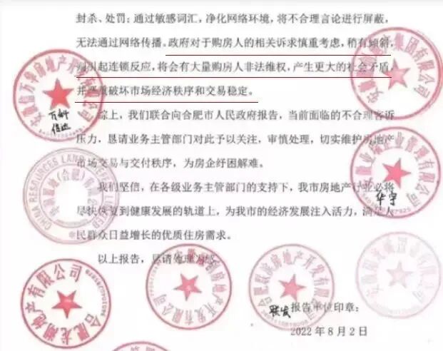 房地产带来的余毒仍未消散。 8月12日,一封《关于请求维护营商环境、增强房企投资信心的纾困解难报告》的文件在网上流传。根据文件内容,有17家房企联名盖章,对合肥市政府发起三大请求: 其一,打击业主“恶意维权”; 其二,约谈自媒体,严禁不合理负面报道,对不实报道自媒体进行封杀、处罚; 其三,通过敏感词汇,净化网络环境,将不合理言论进行屏蔽,无法通过网络传播。 在这三大请求的后面,房企对政府还发出了“善意”的警示:政府对于购房人的相关诉求慎重考虑,稍有倾斜,则引起连锁反应,将会有大量购房人“非法维权”,产生更大的社会矛盾,并严重破坏市场经济秩序和交易稳定。