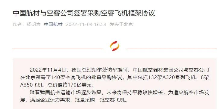 在访华首日,中国就公布了一个大单子。中国与德国签署140架空客大飞机的采购框架协议,包括132架A320系列飞机和8架A350飞机,总价值约170亿美元,送给德国总理舒尔茨一个大礼包。