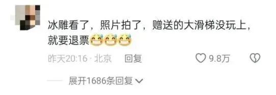 这生意怎么做,都是亏本的买卖。就这,冰雪大世界还遭遇了一次重大的退票事件。因为入园后,很多南方的小土豆没有玩到免费的滑梯,对此不满,高喊退票。这属实有点过分了。像这样的事情,在上海迪士尼、广州长隆等大型游乐园,都是很正常的现象。排不到免费的过山车,难道就全都要退票吗?这是不现实的。
