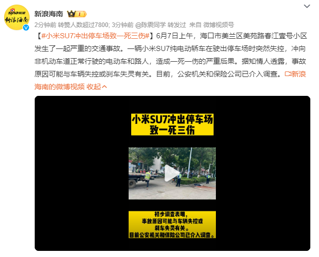 中国车企流量之王,小米SU7出了一个严重的车祸。在海口市美兰区美苑路春江壹号小区,一辆小米SU7驶出停车场,突然失控,冲向非机动车道正常行驶的电动车和路人,造成一死三伤的严重车祸。