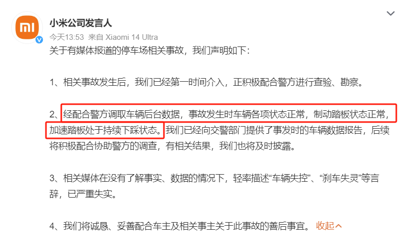 小米SU7在这场事故中,暂时也很难判定为刹车失灵。因为根据小米公司发布的公告称,配合警方调取车辆后台数据发现,车辆整体状态正常,制动系统正常,但加速踏板被持续深踩。按这种说法,大概率是司机误把电门当刹车了。