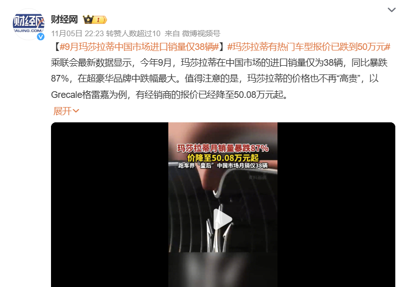 可现在,不仅是保时捷不好卖了,玛莎拉蒂、法拉利、兰博基尼、宾利以及劳斯莱斯等,都出现了不同程度的下滑。其中,玛莎拉蒂在上半年,全球出货量仅6500辆,巨亏8200万欧元。舆论上,一度传出,奇瑞要收购玛莎拉蒂。今年9月份,玛莎拉蒂在中国只卖了38辆,同比暴跌87%。它的起售价也跌到了50.08万元。