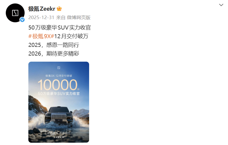 到12月份呢,极氪9X进一步扩大了与M9的差距,不仅稳居第一,月交付量还突破了1万辆。成交均价50万以上,还能月销一万的国产车型,已经有问界M9、极氪9X两款车了。