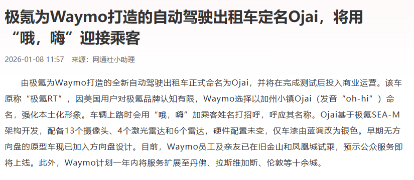 二是,吉利与谷歌合作很深。谷歌旗下的自动驾驶公司Waymo,找极氪汽车,联合研发了一款自动驾驶出租车,名为“Ojai”。