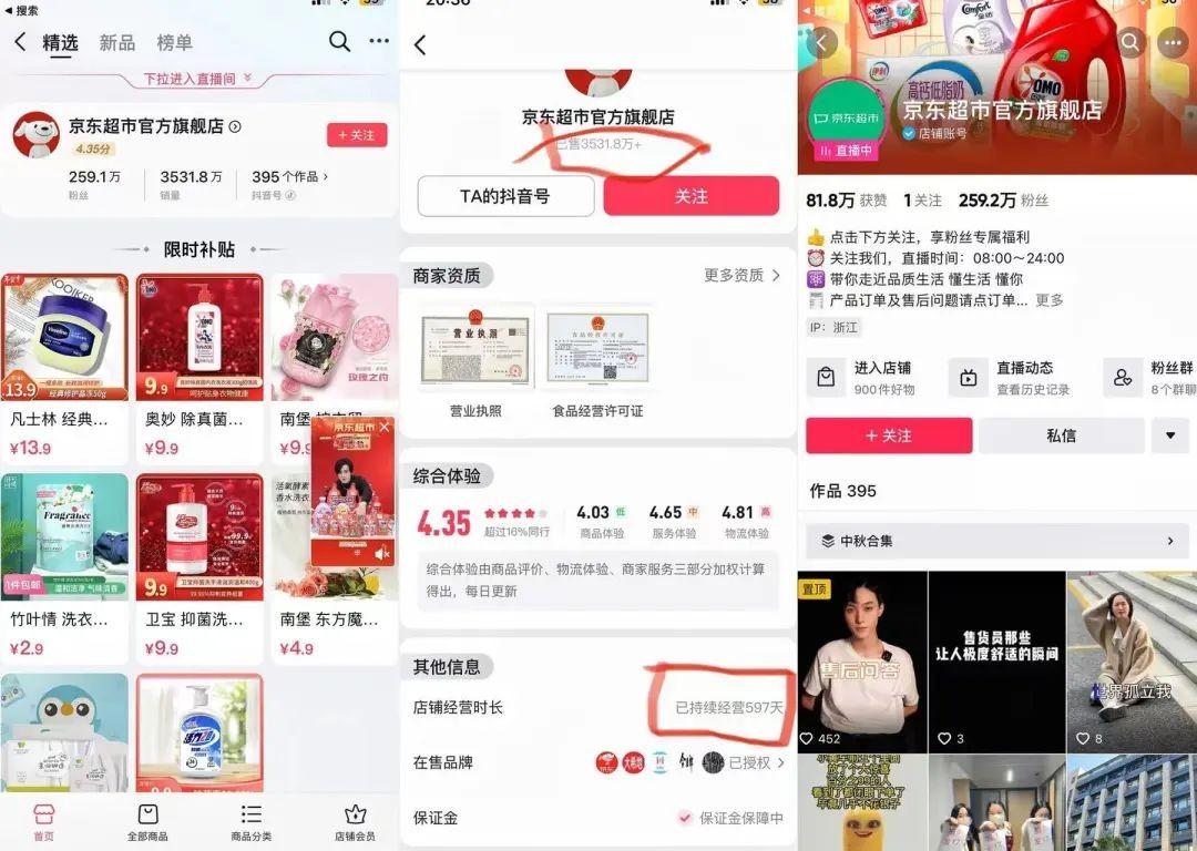 在研究抖音电商中生鲜、快消的零售生态环境时,鲸商发现,截至2023年2月3日,京东超市入驻抖音已有597天,累计销售了3531.8万件(自营)商品,而京东超市的抖音粉丝已达到259万,发布的非隐藏或删除作品有395个。