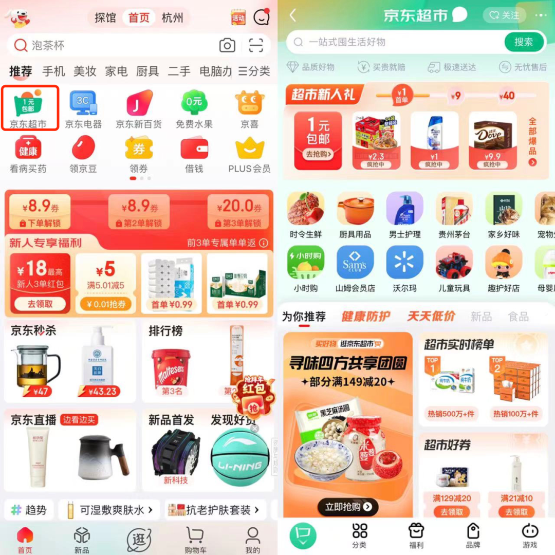 在京东APP首页就有京东超市入口,靠前的位置,可以看出其在集团战略业务中的重要性,天猫超市也是一样。