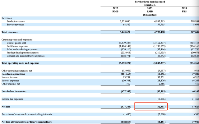 2022年第四季度,叮咚好不容易迎来首次季度盈利,但在2023年第一季度,又陷入了亏损。2023年第一季度,叮咚买菜净亏损5240万元,2022年同期净亏损4.774亿元。