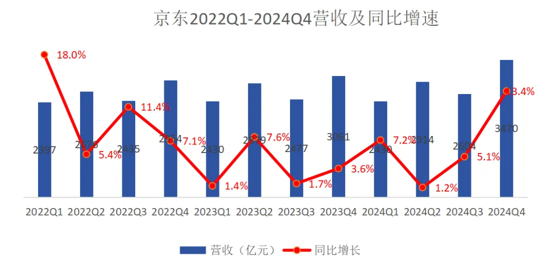 从2022年Q4到2024年Q4,正好是在刘强东回归的时间内,京东终于重新回归两位数增长,历劫成功。Q4京东好起来的原因是什么?