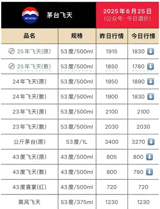 值得注意的是,降价潮不只出现在咖啡茶饮行业,就连白酒“天花板”茅台,也扛不住降价,以53度的飞天茅台为例,近日零售价已跌破1800元/瓶,这一下跌趋势还在延续,一时间在黄牛圈掀起地震。