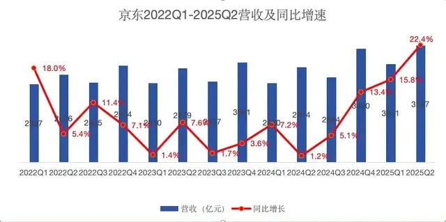 美东时间8月14日盘前,京东发布了业绩公告。2025年Q2京东营收3567亿元,同比增长22.4%。京东的营收是最近3年多以来增长最快的一次。在互联网行业普遍增长放缓的背景下,京东的这份成绩格外亮眼。但是高增长背后的代价是归属于普通股股东的净利润为62亿元,同比下滑50.8%。