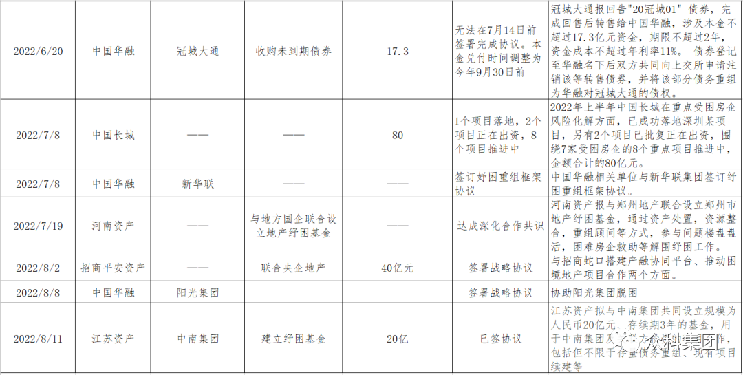 8月5日,中国华融与阳光集团签署《纾困重组框架协议》,帮助整个阳光集团纾困化险。8月11日,江苏资产与中南集团签署了合作框架协议。根据有关协议,江苏资产拟与中南集团共同设立规模为人民币20亿元、存续期3年的基金,用于中南集团及关联方投资的项目合作,包括但不限于存量债务重组、现有项目续建等。从今年3月至今,AMC已经通过盘活出险房企烂尾楼、债务重组、与房企签署战略合作协议、与地方政府层面设立纾困基金等多种方式参与了十多家大型房企的风险化解。