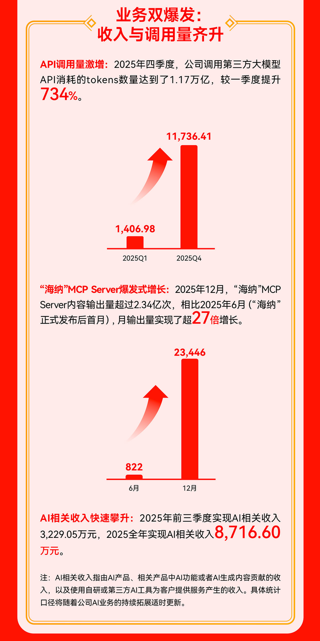值得买科技对AI的持续投入,尤其是在AI创新产品上的投入,不仅为未来增长打开了新的空间,也已开始转化为现实收入。年报显示,2025年,公司实现AI相关收入8716.60万元(包含AI产品、相关产品中的AI功能或AI生成内容贡献的收入,以及使用自研或第三方AI工具为客户提供服务所产生的收入)。这意味着,AI对于值得买科技而言,已经不只是提升效率的辅助工具,也开始形成可量化的收入贡献。