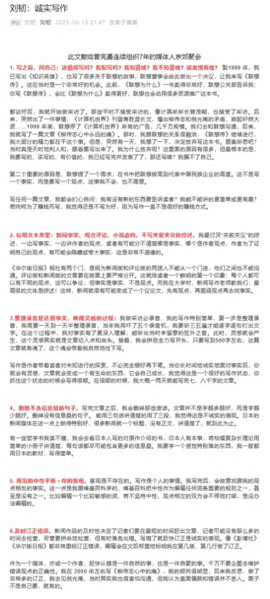 活动后,刘韧老师兴致所致,曾结合现场分享内容撰文发布了一篇题为《刘韧:诚信写作》的文章。