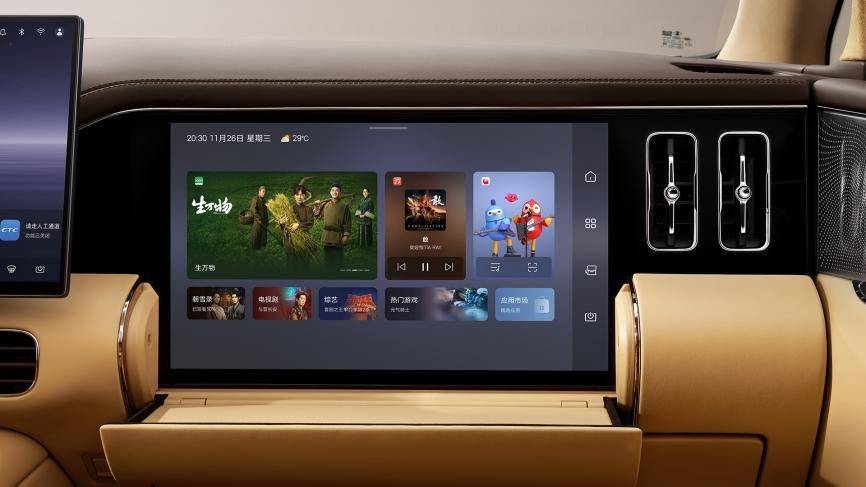 全球首创副驾开合智能屏,开合自如的智能设计,精准适配多元出行场景,可收可放,大小随心。听歌时,用精致小屏;沉浸式观影,一键翻转,秒变专属大屏;折叠台面还可充当置物区,可以随手放墨镜、耳机、口红,兼顾简约美学与实用需求。