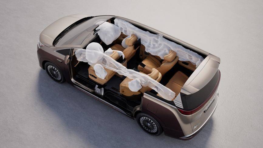 被动安全上,车辆按超五星标准打造「堡垒级安全结构」,整车75%采用高强度钢板,其中包含2000兆帕超高强度热成型钢,筑牢安全防线;全系标配9个安全气囊,其中3.2米同级最长侧气帘,贯穿前中后三排,全方位守护每一位家人。