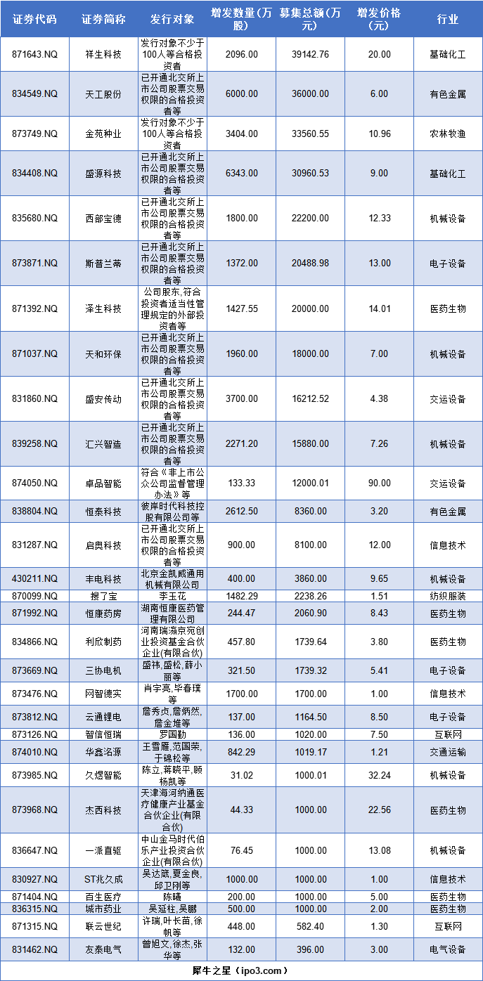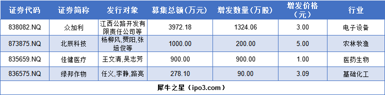 新三板本周4家公司完成股票增发上市,共募资6150万元
