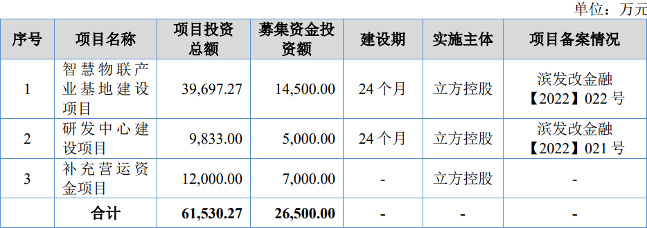 公司IPO募投方面,本次公司拟募资2.65亿元,资金将用于智慧物联产业基地建设项目、研发中心建设项目、补充营运资金项目。