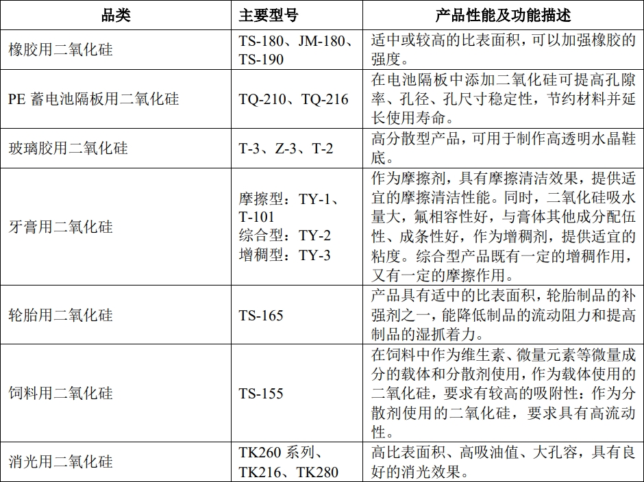 公司产品主要包括橡胶用二氧化硅、PE蓄电池隔板用二氧化硅、玻璃胶用二氧化硅、牙膏用二氧化硅、轮胎用二氧化硅、饲料用二氧化硅、消光用二氧化硅等系列产品。