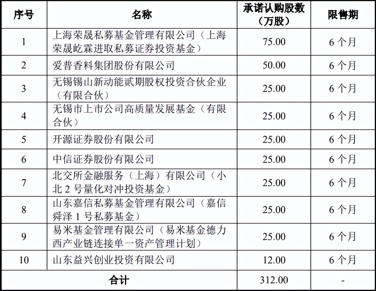 犀牛之星讯,11月28日消息,无锡晶海(836547)北交所IPO战投名单出炉,引入上海荣晟私募基金管理有限公司(上海荣晟屹霖进取私募证券投资基金)、爱普香料集团股份有限公司、无锡锡山新动能贰期股权投资合伙企业(有限合伙)等10家战投共拟认购312万股。