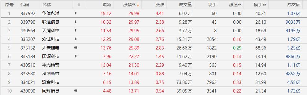 涨幅排行方面,华信永道、联迪信息双双涨30%。
