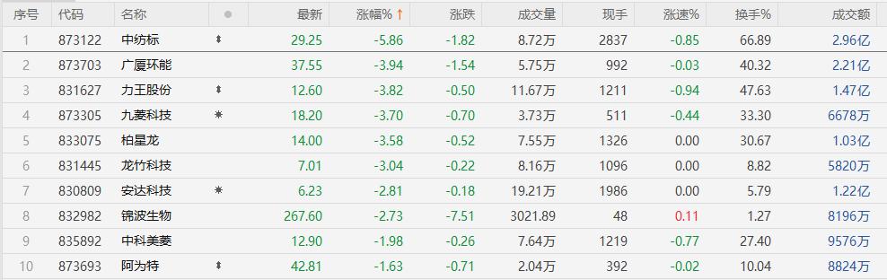 跌幅排行方面,中纺标(873122)跌5.86%居首,广厦环能(873703)跌3.94%次之。