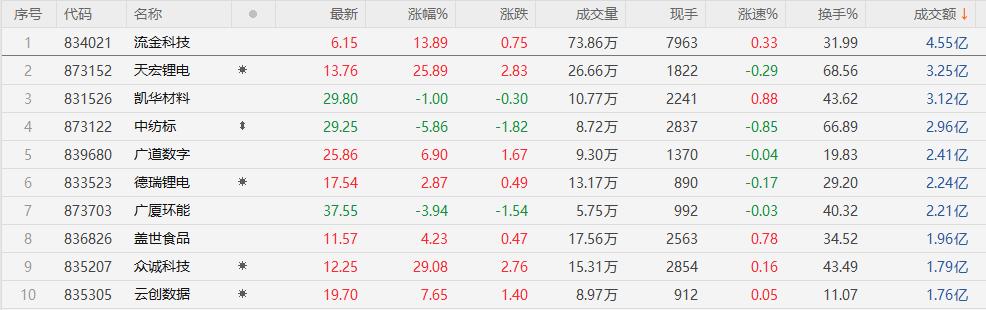 成交额方面,北交所全天共成交140.51亿元,流金科技(834021)成交4.55亿元居首,天宏锂电(873152)成交3.25亿元次之。