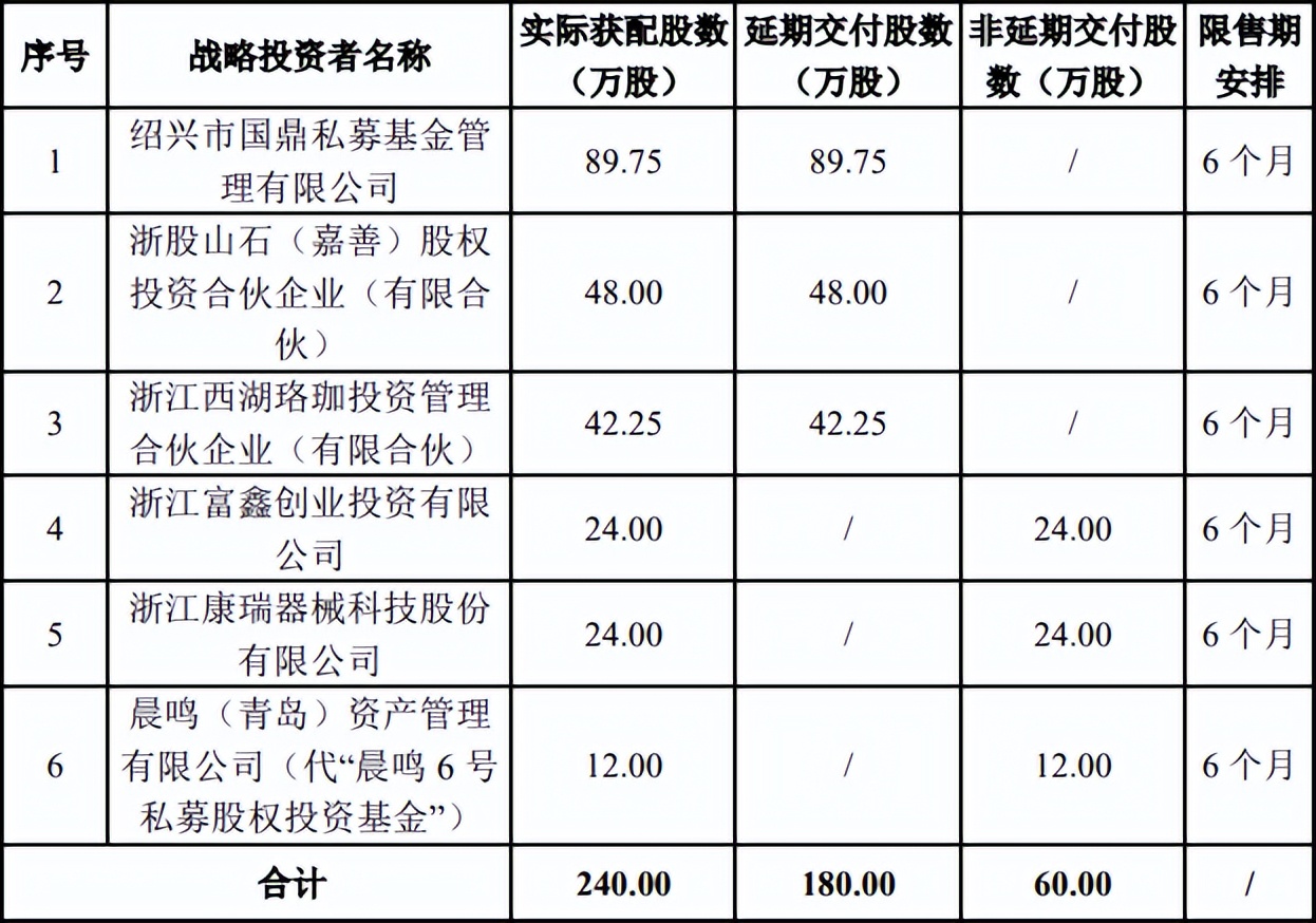在已完成缴款的战略配售环节,捷众科技引入绍兴市国鼎私募基金管理有限公司、浙股山石(嘉善)股权投资合伙企业(有限合伙)、浙江西湖珞珈投资管理合伙企业(有限合伙)等6家战投。