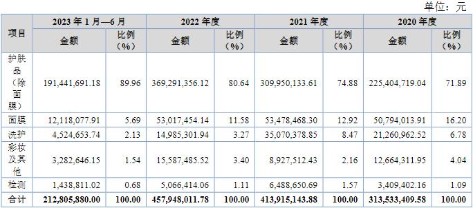 从营收结构来看,护肤品(除面膜)是公司营收的重要来源。2020-2022年度,护肤品(除面膜)分别实现营收2.25亿元、3.10亿元、3.69亿元,占主营业务收入的比重分别为71.89%、74.88%、80.64%;2023年H1护肤品(除面膜)实现营收1.91亿元,占主营业务收入的比重为89.96%,收入规模及所占比重均逐年提升。
