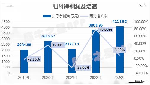 归母净利润方面,公司归母净利润从2019年的2084.99万元增长至2023年的4115.92万元,CAGR为18.53%,2023年归母净利润与上年同期相比增长8.20%。