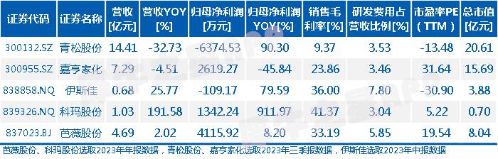 结合芭薇股份主营业务内容,选取青松股份(300132)、嘉亨家化(300955)、伊斯佳(838858)、科玛股份(839326)作为公司同行业可比公司。