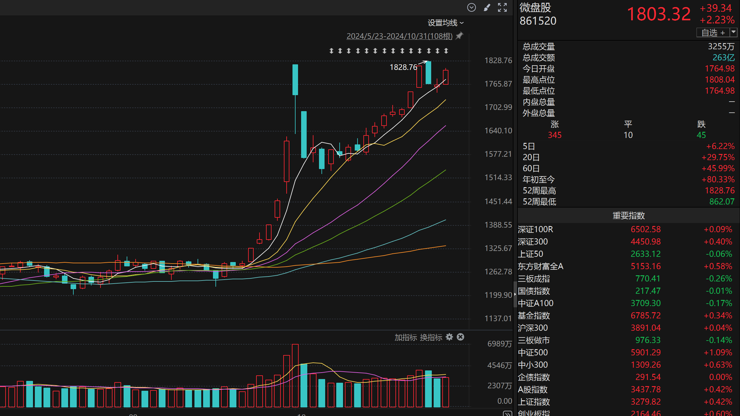 并且从近期微盘股的走势来看,在今日(10月31日)沪深指数明显放量的情况下,微盘股指数成交量却明显低于前几日,微盘股指数在10月29日盘中创下新高后却出现了高位钝化。