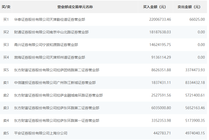 根据龙虎榜交易数据显示,买入方面,买一为华泰证券股份有限公司天津勤俭道证券营业部,买入2200.67万元,卖出6.6万元。买二为财通证券股份有限公司南京中山北路证券营业部,买入1818.76万元。卖出方面,卖一为中信建投证券股份有限公司广州珠江新城证券营业部,卖出833.44万元,买入183.74万元。卖二为东方财富证券股份有限公司拉萨金融城南环路证券营业部,卖出572.14万元,买入252.75万元。