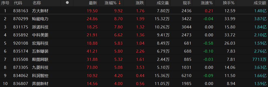 涨幅排行方面,方大新材(838163)涨9.92%居首,灿能电力涨8.70%次之。