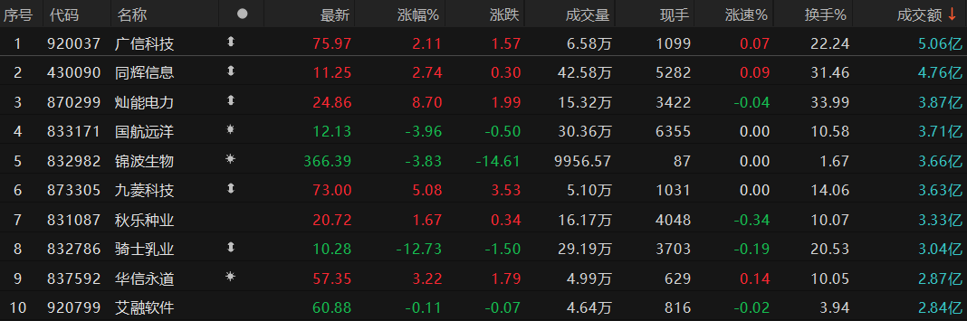 成交额方面,北交所全天共成交185.7亿元,广信科技(920037)成交5.06亿元居首,同辉信息(430090)成交4.76亿元次之。