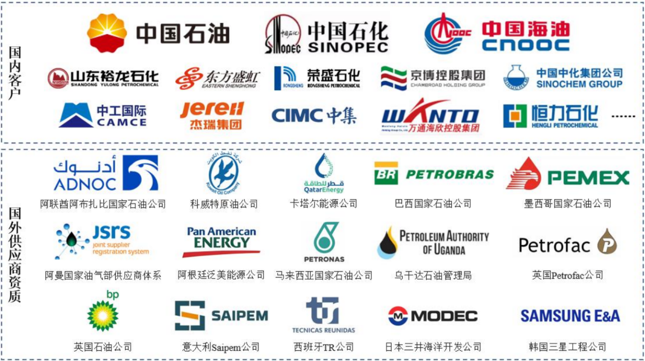 目前,公司是中国石化、中国石油、中国海油的合格供应商,并与裕龙石化、东方盛虹、荣盛石化、京博控股集团等知名公司建立了长期稳定的合作关系。在国际市场上,紧随国家“一带一路”战略,产品远销新加坡、印度尼西亚、阿尔及利亚、尼日尔、伊拉克、巴西、乍得、哈萨克斯坦等二十余个国家和地区。公司获得了阿联酋阿布扎比国家石油公司、科威特原油公司、卡塔尔能源公司、巴西国家石油公司、墨西哥国家石油公司、意大利油服集团塞班公司(Saipem)和英国派特法石油工程公司(Petrofac)等合格供应商资格。稳定的客户合作关系为公司未来在国内和“一带一路”等国际市场的业务拓展提供了良好基础。