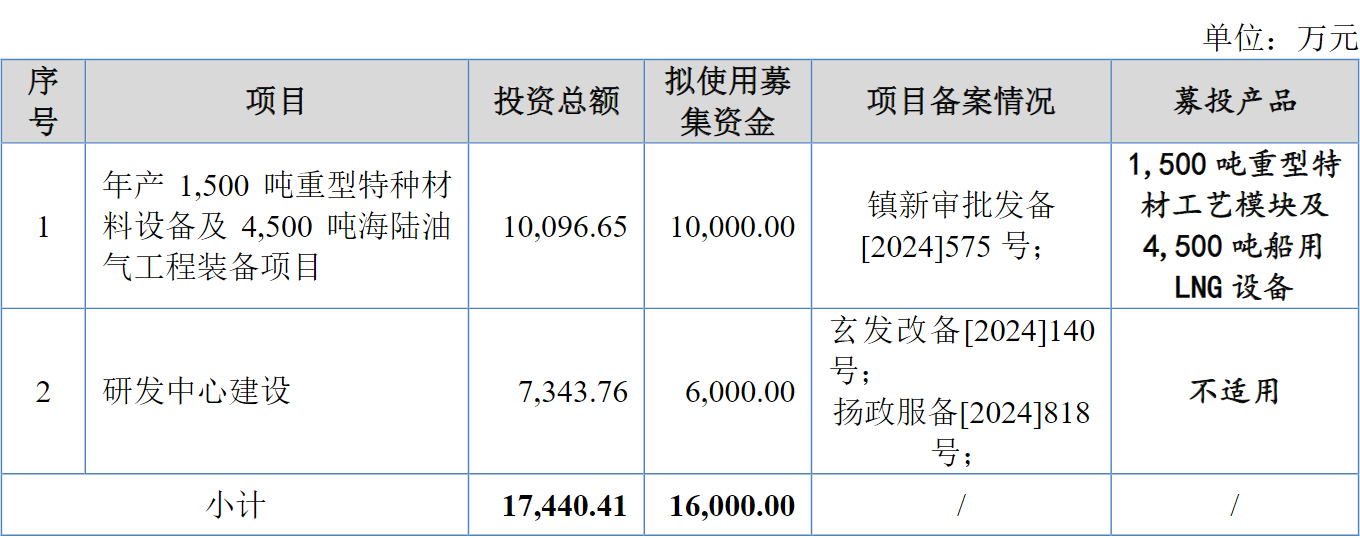 本次IPO拟募集资金1.6亿元用于年产1,500吨重型特种材料设备及4,500吨海陆油气工程装备项目和研发中心建设。
